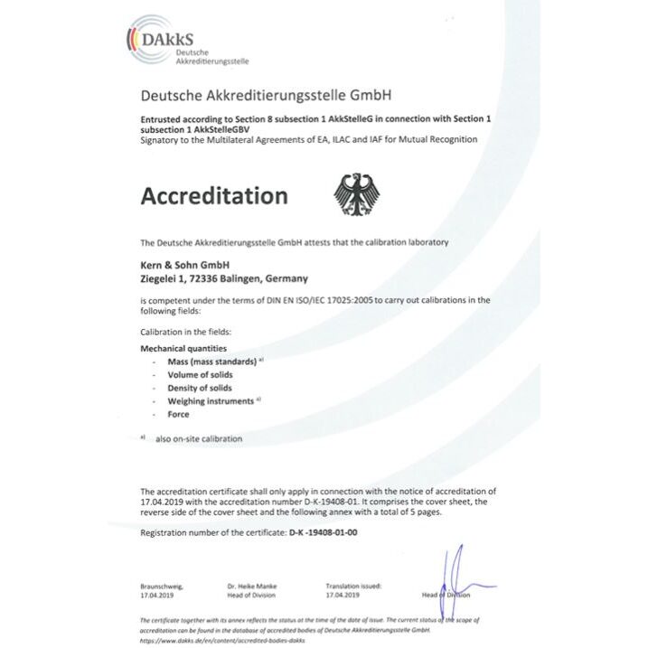 Certificat etalonare DAkkS pentru greutate etalon KERN, clasa F1/F2 SET 1 mg - 50 g