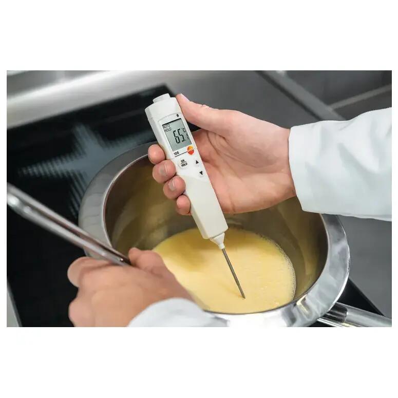 Termometru compact testo 106 cu vârf de măsurare foarte subţire şi robust, este excelent pentru măsurarea temperaturii produselor alimentare în gastronomie, hoteluri, mari bucătării, supermarketuri, etc.
